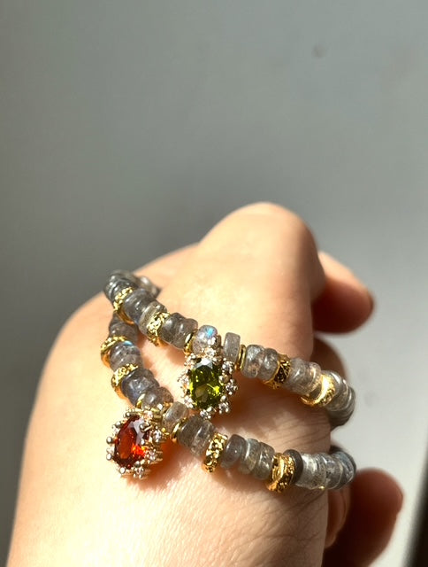 Monté sur un lien en labradorite de 40cm et orné d’un pendentif en doublet grenat serti délicat de petits zircon